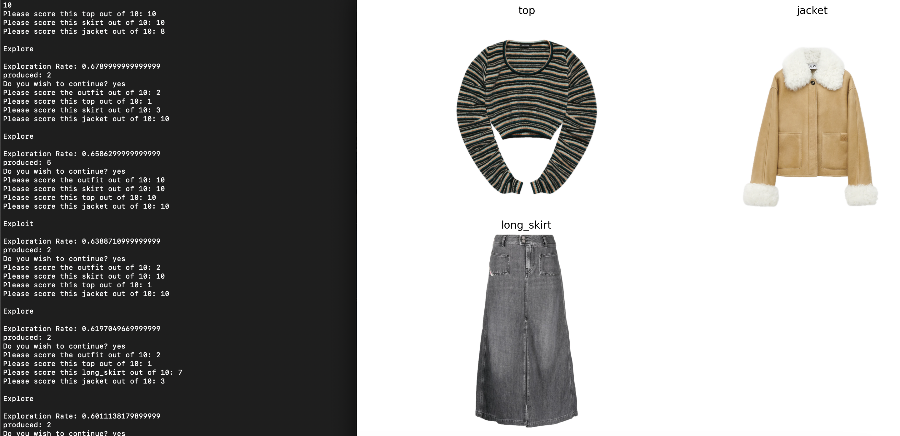 Demonstrates the potential for Machine Learning to be used for styling outfits, based on aesthetics collated from various collections and designers from across the decades. Uses a Machine Learning algorithm created from scratch to explore a ‘feature space’ of attributes, such as prominent colours and silhouettes, to output an outfit comprised of suitable clothing items. Recommendations are produced in response to user feedback.