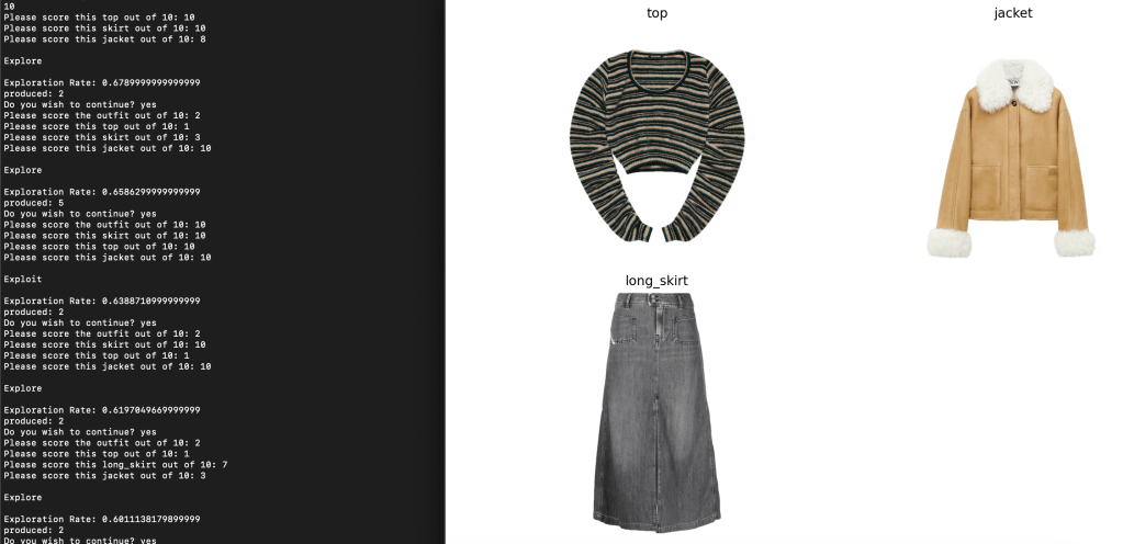 The stylist then explores this outfit cluster space, adjusting it’s search by branching out or exploiting known user preferences.